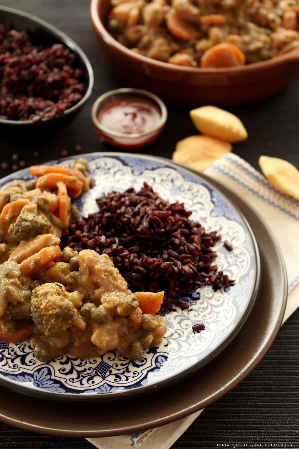 Regolate di sale e proseguite la cottura unendo ancora un po’ d’acqua (o latte vegetale) se il curry dovesse asciugarsi molto, mescolate di tanto in tanto per evitare che si asciughi ai lati. Quando tutte le verdure saranno cotte servite il curry con il riso venere e, se vi piace, la salsa agrodolce (senza l’ananas).