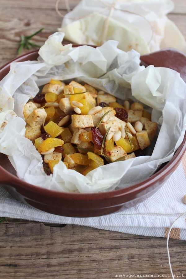 La cosa fighissima è che tutta sta roba, che sembra un lavoraccio, richiede davvero poco tempo e poca fatica, potete preparare tutto all’ultimo se usate delle verdure che possono cuocere completamente in forno senza bisogno di essere sbollentate. Ad esempio se avete una cena, questa ricetta è l’ideale. Portare in tavola il cartoccio è sempre carino e accompagnando il tofu con del riso basmati avrete realizzato un piatto unico che riempirà le pance dei vostri ospiti. Sarà sufficiente chiudere con un bel dolce e se non avete voglia di spignattare quello fatelo portare a loro 😉